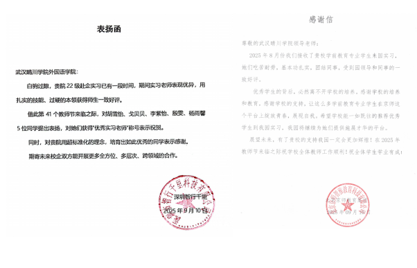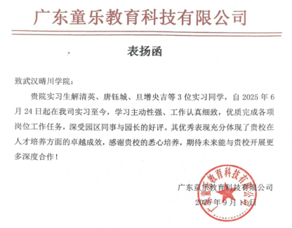 深圳智行千里科技公司为胡雪怡、戈贝贝、李紫怡等5名员工授予“优秀实习老师”称号,肯定其扎实的技能、过硬的本领,并点赞公司对教师培养的育人理念。北京京师智雅教育科技有限公司相关园所 在感谢信中提到,该校学前教育专业实习生“吃苦耐劳、基本功扎实、团结同事”,期待公司持续推荐优秀学子,双方共同为学子搭建绽放青春、展现自我的平台。广东童乐教育科技有限公司则表扬解清英、唐钰城、旦增央吉3名实习同学学习主动性强、工作认真细致,认为其优秀表现是公司人才培养卓越成效的直接体现。