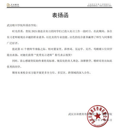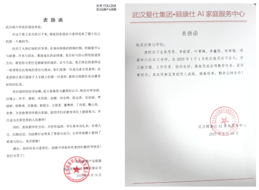 武汉百训教育咨询有限公司将“优秀实习老师”称号授予董家笑、薛善琦、吴远学等5名员工,表扬学子们良好的职业素养,并感谢公司“深耕教学、精研培育”的高标准育人模式。武汉优职幼教产业联盟特别表扬李诗琪、汪晴云、牟芊等19名实习老师,称赞他们以目标与信心克服迷茫,用行动诠释教师称谓的责任与使命,成为孩子们“人生路上的第一位老师”。武汉颐康仕AI家庭服务中心对徐思思、李丽君、叶青梅等6名实习生给予高度评价,认为他们“学习能力强、工作负责、协作良好”,高效完成各项教学任务,充分彰显公司育人成效。